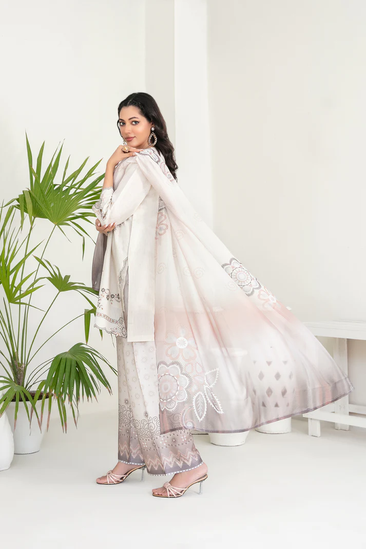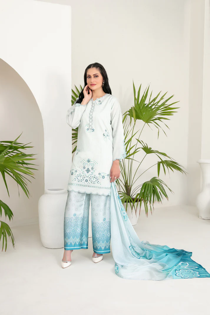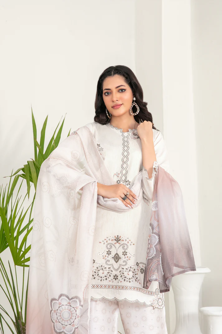 Kamari – 3 Piece Unstitched Embroidered Cotton Khadi Suit with Digital Printed Dupatta by Tawakkal Fabrics